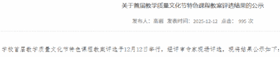 近日,学校质量管理与评价处公布了《关于首届教学质量文化节特色课程教案评选结果的公示》,肉漫屋