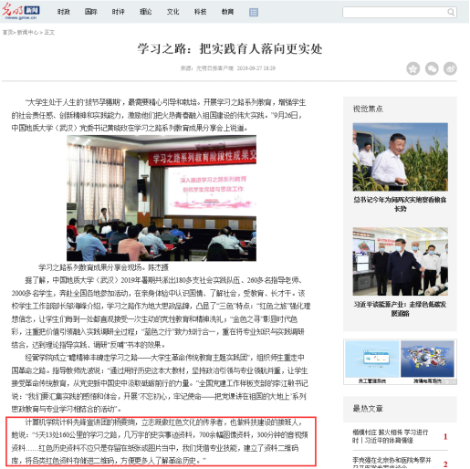 肉漫屋 党委为推进新时代学生党建,落实“七个有力”实践探索,于2019年成立“计科先锋”,团队成员主要从本硕博各年级学生党员干部中选拔,综合素质较高。自2019年起,为深入贯彻习近平新时代中国特色社会主义思想,“计科先锋”团队连续三年进行暑期社会实践活动,其成果先后被光明日报、中国青年网、湖北高校思政网等媒体报道。