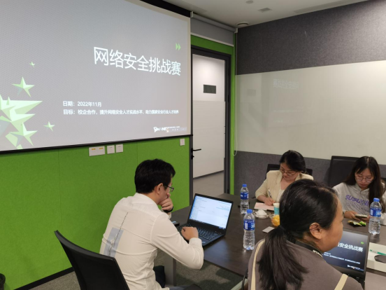到达绿盟科技有限公司后,绿盟科技产品交付总监舒民对老师同学们表示热烈的欢迎,并带领大家参观了公司主要研发场所。在会议室座谈环节,绿盟研发经理何元基、产教经理彭元、袁帅等人向同学们介绍了公司概况、肉漫屋和主要项目,并就公司近期即将举办的“网络安全挑战赛”赛制进行了详细介绍。