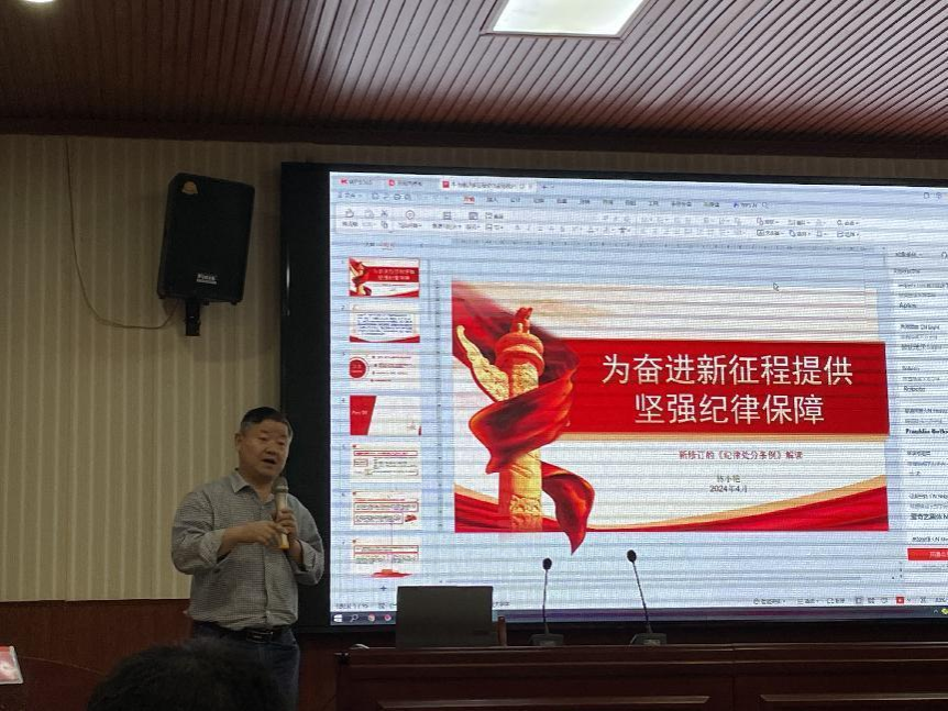 林小艳认为,贯彻执行新修订的党纪处分条例要真抓实干、善作善成。党员干部要切实担负起全面从严治党的政治责任,以身作则,坚决杜绝违规违纪踩“红线”、越“底线”、闯“雷区"的行为。她结合科研经费违规使用、教师学术不端、把关学生不严等案例,重点解读了与高校教师党员密切相关的条例内容,以案明纪,以案示警。