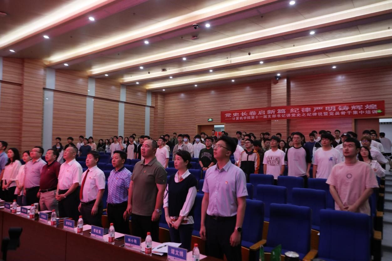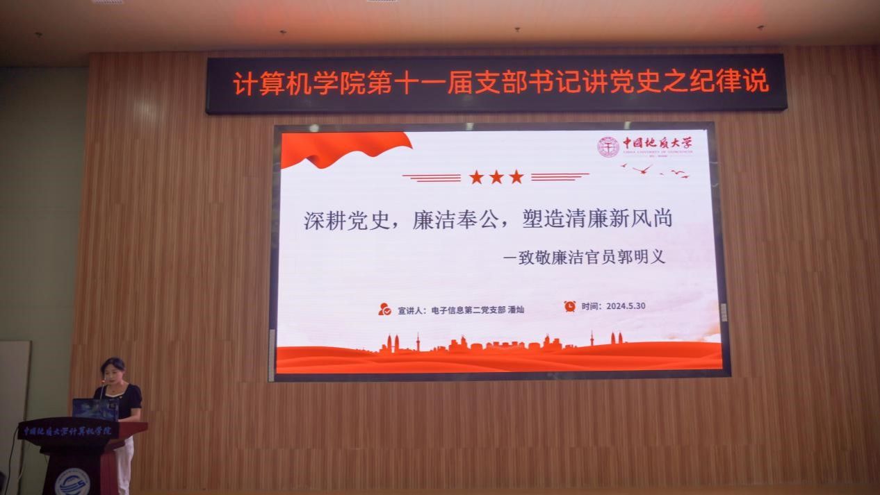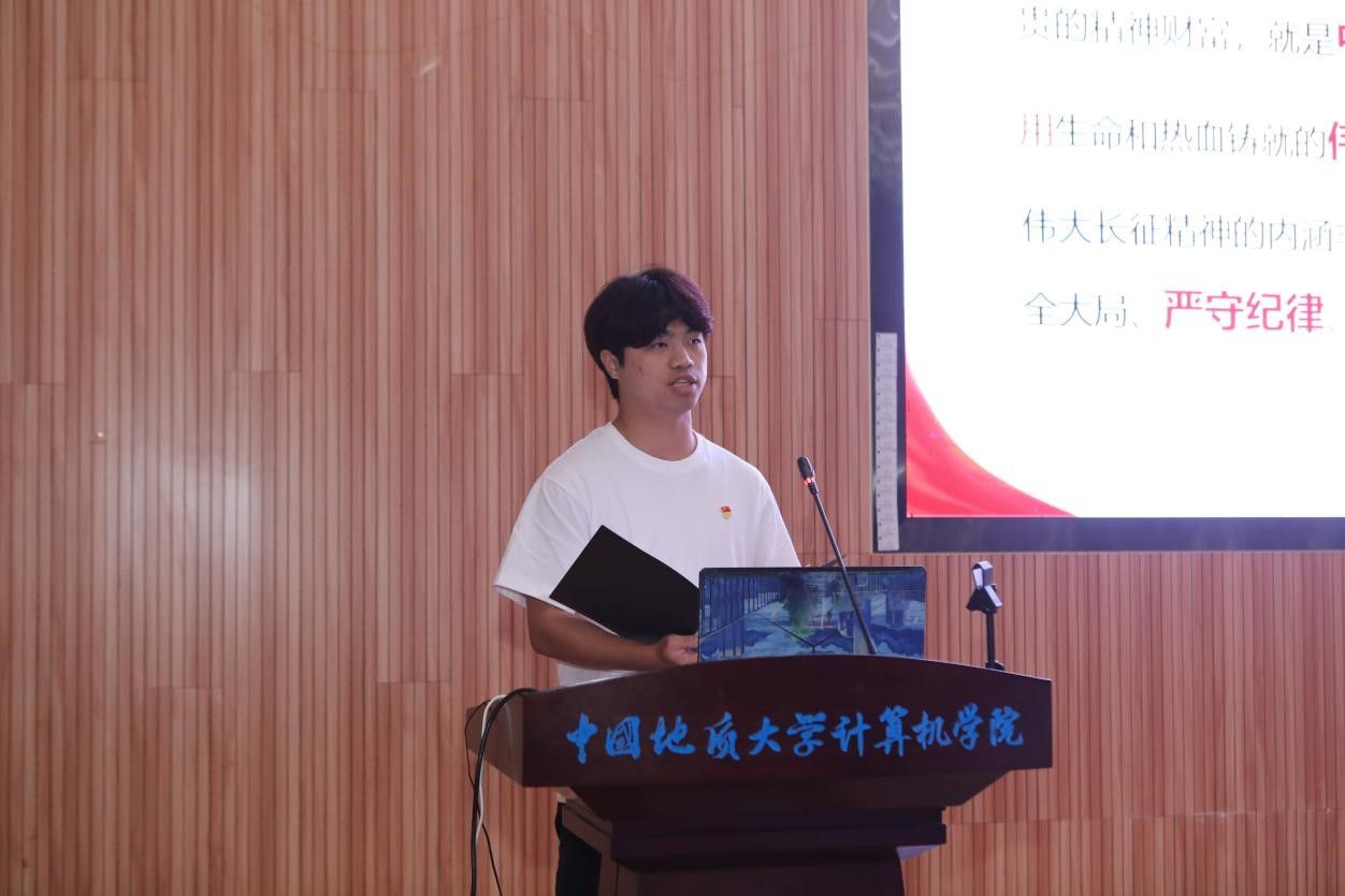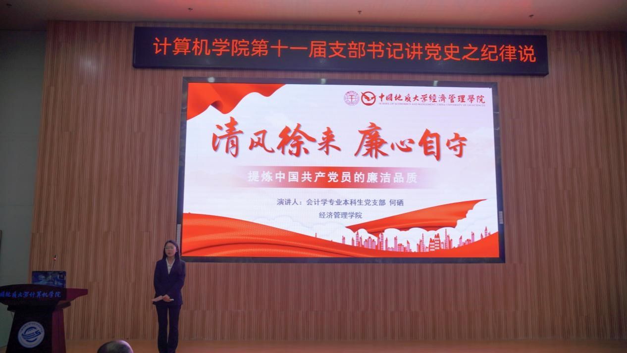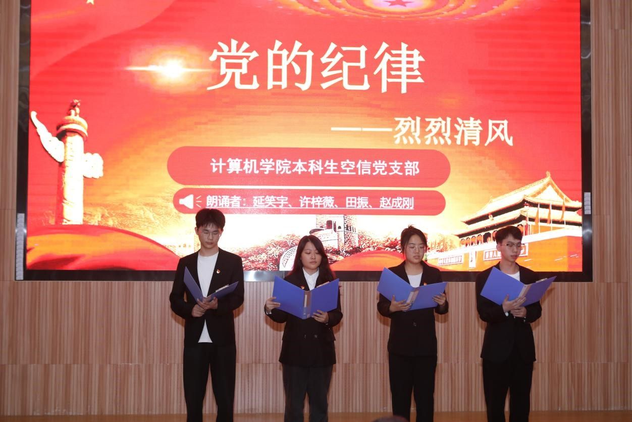活动在雄壮的国歌声中拉开帷幕。学生党支部书记率先登场。电子信息第三党支部朱国强以刘邓大军的严明军纪为例,强调了纪律在军队建设中的重要作用。本科生信安党支部郭鹏顺则从新民主主义革命时期的党纪建设出发,强调了坚守初心、严明纪律的意义。本科生空信党支部延笑宇等多名成员以“党的纪律:烈烈清风”为题的诗歌朗诵,声情并茂地展现出对党廉政建设的歌颂。本科生计科第一党支部王诗敏则以延安廉政的故事为蓝本,深入剖析了党在推动廉政反腐方面的必要性和坚定决心。电子信息第二党支部潘灿通过讲述郭明义的故事,展现了廉洁奉公、无私奉献的崇高精神。电子信息第一党支部胡长浩深刻阐述了铁纪在长征这一伟大的历史事件中的关键作用。在肉漫屋 空间信息工程党支部与经济管理学院生态文明研究生样板党支部成员的精心编排下,以一场独具特色的话剧将现场气氛推向了高潮,生动诠释了“亲民爱民、艰苦奋斗、科学求实、迎难而上、无私奉献”的“焦裕禄精神”。
