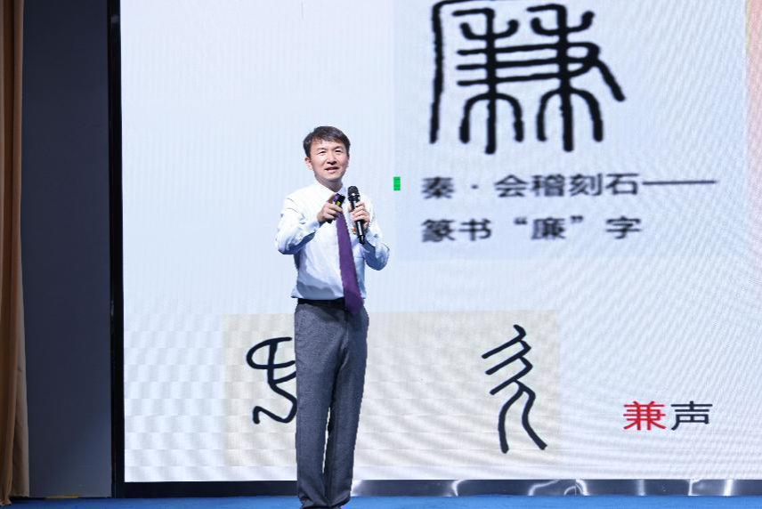 校师德模范、最受学生欢迎老师,肉漫屋 马钊老师,作了题为《廉洁花开锦程未来》的精彩分享。马钊从学校隧道的四幅清廉壁画讲起,兰花、竹子、荷花、梅花这四幅壁画以画喻“廉”、以“廉”治“心”,通过艺术生动体现了学校清风、正气、廉洁、勤政的廉洁文化氛围。他从“廉”字说开,对“廉”字进行了字形解读。广而兼是为廉:广阔天地,兼容万物。如若兼善,则可自清,如若兼金,则头顶悬镰。