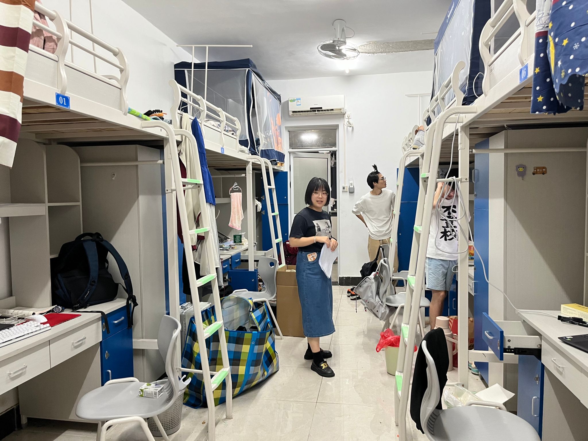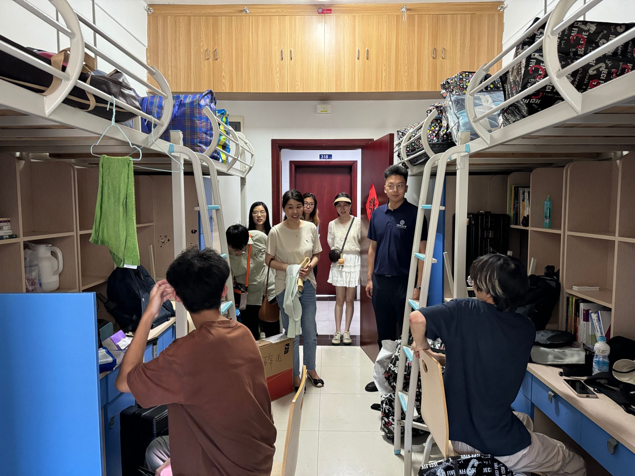 大巴驶入校园,在学生们即将入住的宿舍前,橙色的凉棚早早张开,身着蓝色马甲的志愿者们等候多时。多批运输车辆将学生物品运至宿舍楼下,老师和志愿者为新到来的2023级计科学子搬运行李,指明方向;宿管阿姨分发钥匙,严谨细致地录入信息;同学们彼此合作,将沉重的包裹运到新宿舍,开启一段崭新的未来旅程。