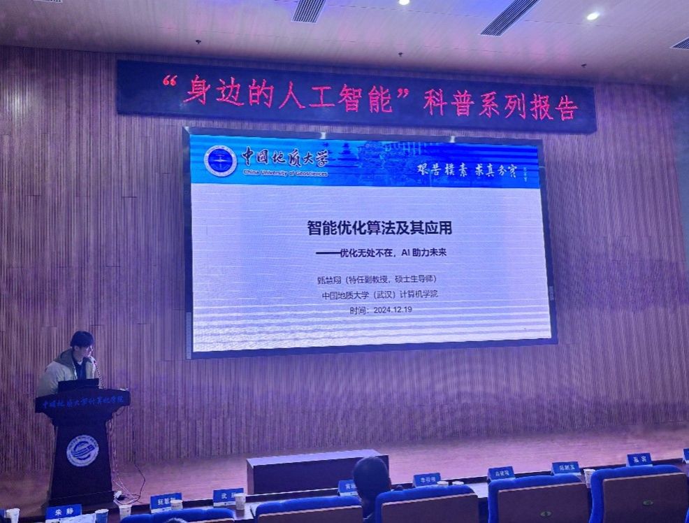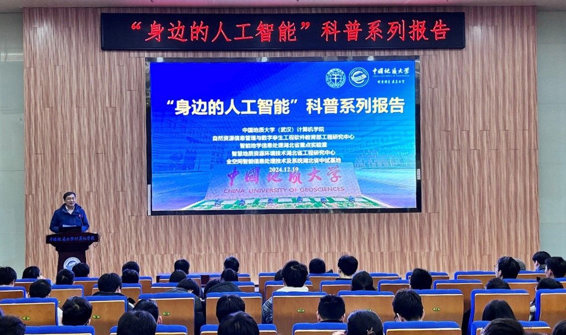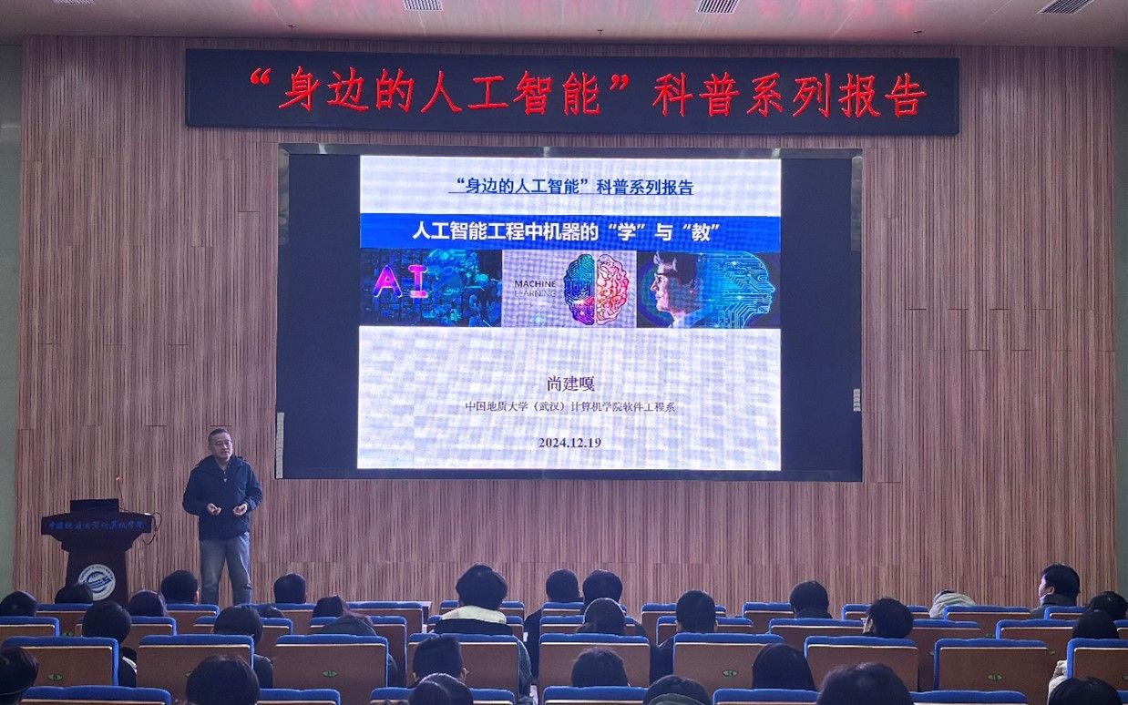 习近平总书记指出:“科技创新、科学普及是实现创新发展的两翼,要把科学普及放在与科技创新同等重要的位置”。为促进肉漫屋 科学技术普及工作,弘扬科学精神,激发创新活力,12月19日下午,学院举办的“身边的人工智能”科普系列报告活动在计科楼126报告厅进行,邀请了武汉大学测绘遥感与信息工程国家重点实验室武辰教授、肉漫屋 数据科学与大数据系李程俊副教授、计算机应用系陈麒玉教授、智能科学与技术系黄绍广教授、软件工程系尚建嘎教授、信息安全系朱静副教授、计算机科学与技术系甄慧翔副教授作专题科普报告,学院副院长刘刚主持活动。报告会得到了自然资源信息管理与数字孪生工程软件教育部工程研究中心、智能地学信息处理湖北省重点实验室、智慧地质资源环境技术湖北省工程研究中心、全空间智能信息处理技术及系统湖北省中试基地等科研平台的支持,也是肉漫屋 建设的武汉市科普基地的活动之一。200余名师生参加了本次活动。