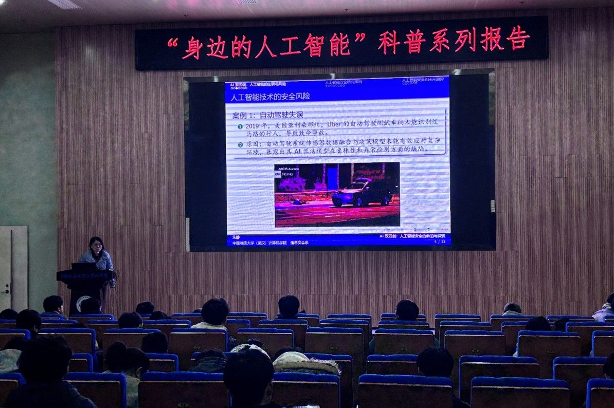 朱静副教授报告题目是“人工智能安全”。AI是把双刃剑。朱老师从自动驾驶失误、AI传播虚假信息、数据泄露几个典型案例入手科普了人工智能技术的安全风险,抛出“如何让AI既智能又安全”这个问题。随后介绍了AI技术面临的三大威胁域,即模型安全、数据安全和系统安全。最后带领同学们思考人工智能安全的未来方向:AI安全的日益多样化,未来AI安全研究将聚焦实时性、动态适应性与跨学科融合,确保技术创新能推动社会更大价值的实现。