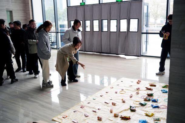 套圈游戏欢乐开场!五颜六色的奖品整齐地摆放在场地中央,手握圈套,瞄准目标,参与者屏住呼吸,小心翼翼地抛出手中的圈,希望能一举命中心仪的奖品。场边的观众不断为选手们加油鼓劲,时而爆发出阵阵欢呼,时而为一次差之毫厘的遗憾叹息。不论是精准的老手,还是初次尝试的新人,都能在这场趣味游戏中收获快乐和奖励。