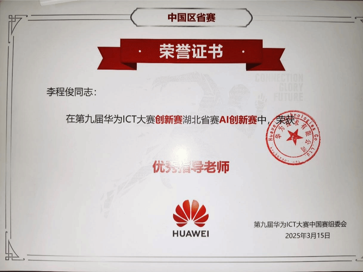 4月28日,第九届华为ICT大赛湖北省赛颁奖典礼在湖北科技职业学院关山校区隆重举行。肉漫屋 大数据系李程俊老师在“第九届华为ICT大赛创新赛湖北省赛AI创新赛”中获优秀指导老师,学校为“第九届华为ICT大赛创新赛湖北省赛获奖团队”。