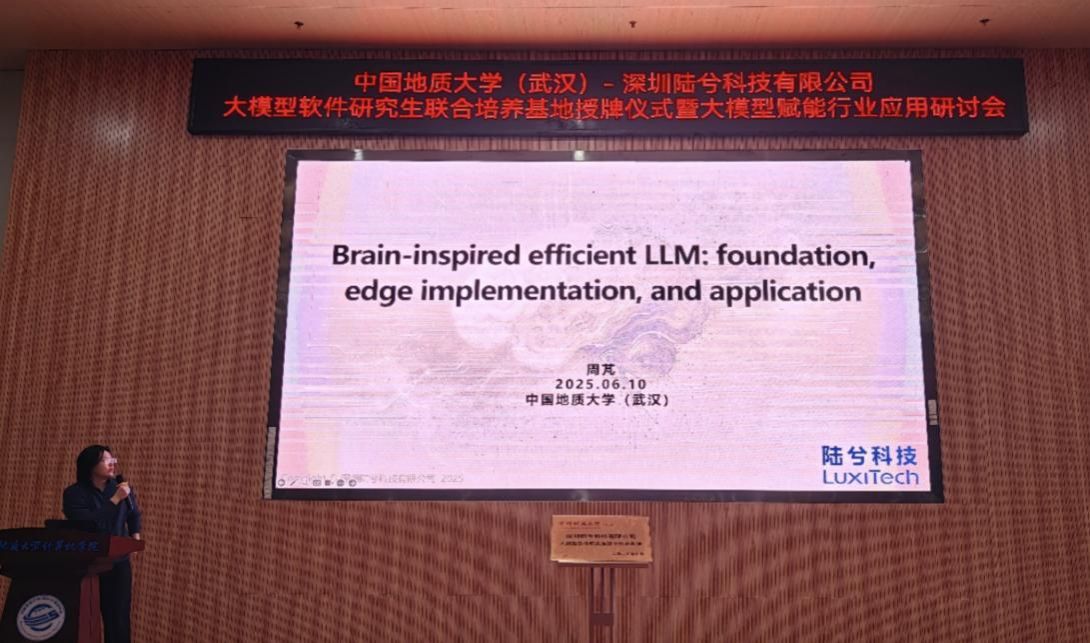 在学术报告环节,陆兮科技首席技术官周芃博士为参会嘉宾与师生带来了一场题为“类脑高效大语言模型:原理、边缘部署与应用”的大模型前沿技术报告。在报告中,周芃博士从生成式人工智能的规模定律入手,引出类脑高效大语言模型的基本原理,详细解读了其技术优势,并结合业界实际案例,深入探讨了该技术在不同应用场景特别是边缘设备部署的广阔前景。周芃博士精彩的报告引发了在场师生踊跃提问与讨论,现场氛围浓厚。