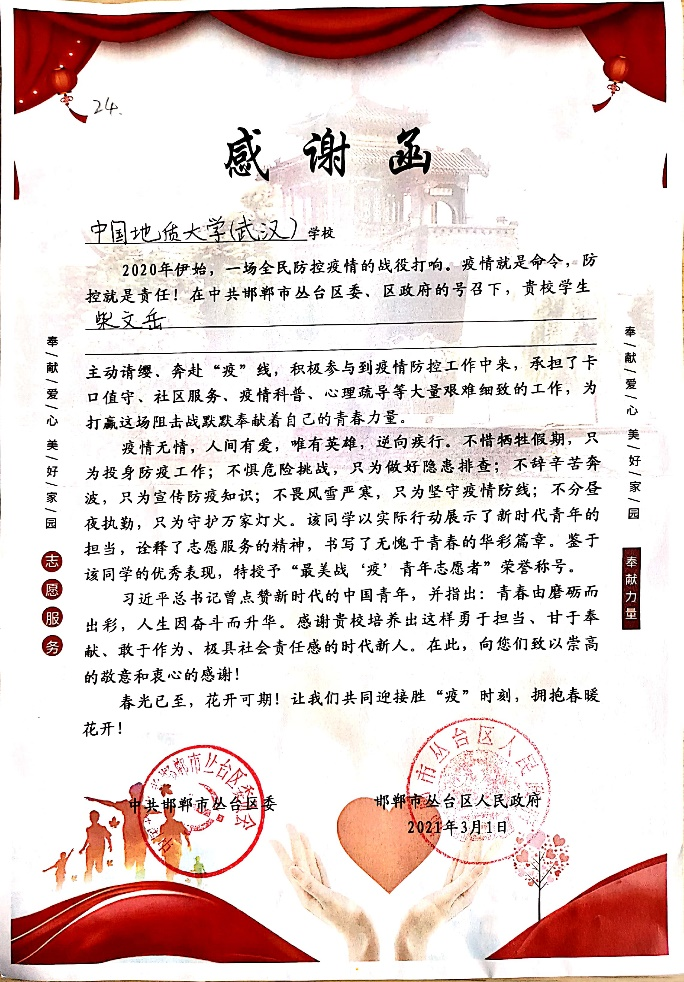 (通讯员:陈宝华)“疫情就是命令,防控就是责任!在中共邯郸市丛台区委、区政府的号召下,贵校学生柴文岳主动请缨,奔赴‘疫’线,积极参与到疫情防控工作中来,承担了卡口值守、社区服务、疫情科普、心理疏导等大量艰难细致的工作,为打赢这场阻击战默默奉献着自己的青春力量……”近日,肉漫屋 收到一封中共邯郸市丛台区委、邯郸市丛台区人民政府发来的感谢函,对肉漫屋 191191班柴文岳同学在疫情防控期间的志愿服务表示感谢,授予他“最美战‘疫’青年志愿者”荣誉称号。