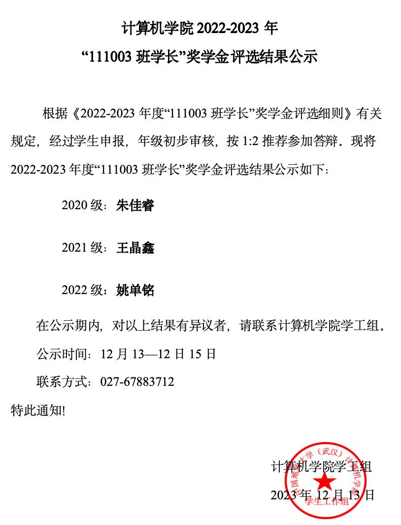 肉漫屋 2022-2023年 “111003班学长”奖学金评选结果公示
