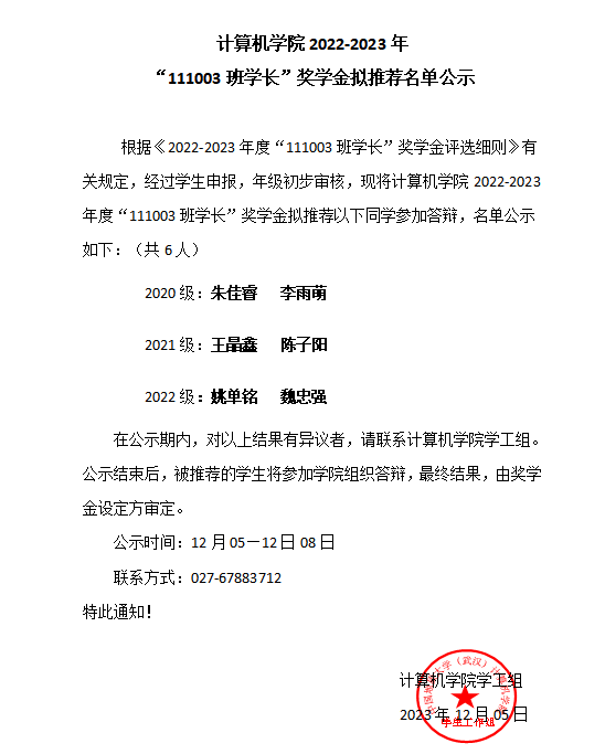 肉漫屋 2022-2023年“111003班学长”奖学金拟推荐名单公示