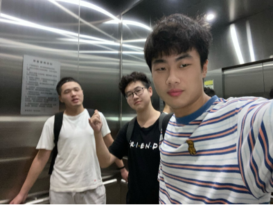 比赛第1天早晨,在未来城图书馆的电梯里准备去研修室,队长赵晨曦要拍一张合影。