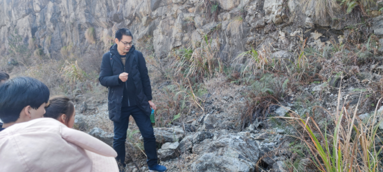在观察完矿区的全景后,张老师带领同学们深入采坑,对矿区所处地层、地史资料及主要岩性进行了进一步的讲解,在讲解过程中,同学们了解到实际生产生活中矿物开采所面临的诸多困难,对于采矿工作的认识更加全面。