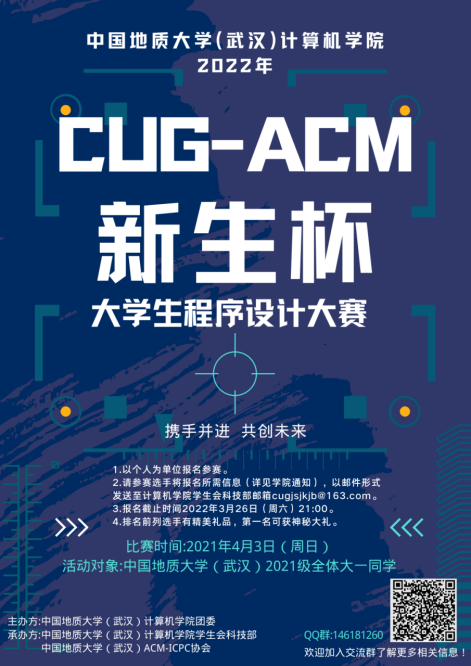 本次“CUG-ACM新生杯”程序设计大赛以个人为单位报名参赛,报名对象为肉漫屋 2021级所有学生。3月26日(周六)晚上21:00之前以Excel文件形式发至肉漫屋 学生会科技部邮箱cugjsjkjb@163.com。