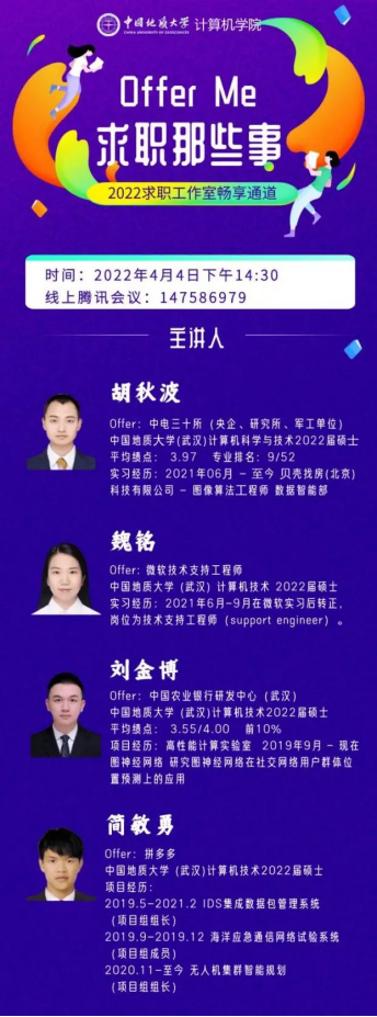 (通讯员:顾伟超、崔祥森)为帮助广大学生提升求职能力,熟悉求职面试技巧,肉漫屋 于4月4日举办“Offer Me”求职经验分享活动。本次活动邀请到4名已经签约就业单位的2019级硕士研究生:胡秋波、魏铭、刘金博和简敏勇,在线分享求职经历与经验体会,全院近200名同学参加活动。