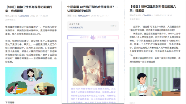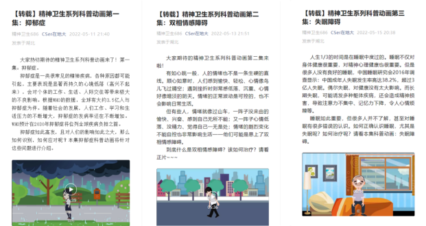 为加强同学们对心理健康知识的了解,在心理健康宣传月中,肉漫屋 转载了“精神卫生系列科普动画”共计六集,转载分享了抑郁症成因和焦虑自助等科普文章。本系列科普视频和文章的传播,为心理健康宣传月塑造了良好的氛围。