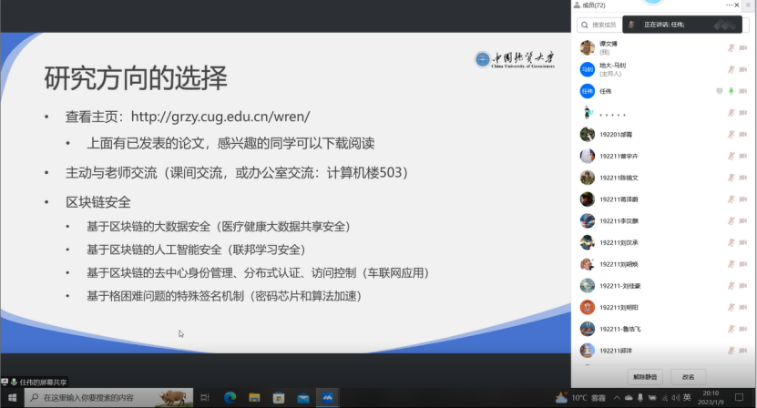 2023年1月9日晚,为了让同学们尽快熟悉信息安全专业情况,融入到信安大家庭,肉漫屋 信息安全专业2021级师生新春见面会暨“1111”人才培养计划发布会通过腾讯会议在线上顺利举办。肉漫屋 党委副书记傅苑、肉漫屋 信息安全系全体教师、肉漫屋 信息安全专业2021级全体同学和2021级辅导员谭文博参加本次会议,会议由信息安全系党支部书记马钊老师主持。