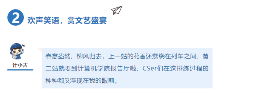 在春日时光,为Cser们提供欢声笑语与无穷乐趣。在周末晚上,伴着阵阵柔风我们肆意欢笑,聆听笑话包袱里的文化内涵,在青春之际共赏文艺盛宴。