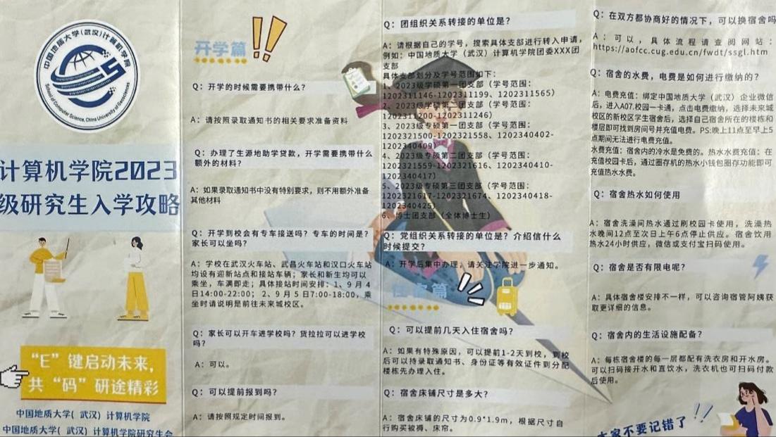 “E”键启动未来,共“码”研途精彩。为了帮助新生报到畅通无忧,学院精心制作了“肉漫屋 2023级研究生入学攻略”,攻略分为开学篇、学习篇、生活篇三部分,帮助同学们全方位了解开学时需携带的相关材料、课程培养、团组织关系转接等事项,同时一一解答关于体育馆预约、宿舍水费电费缴纳、热水使用、宿舍管理等问题,帮助新生尽快熟悉校园环境。