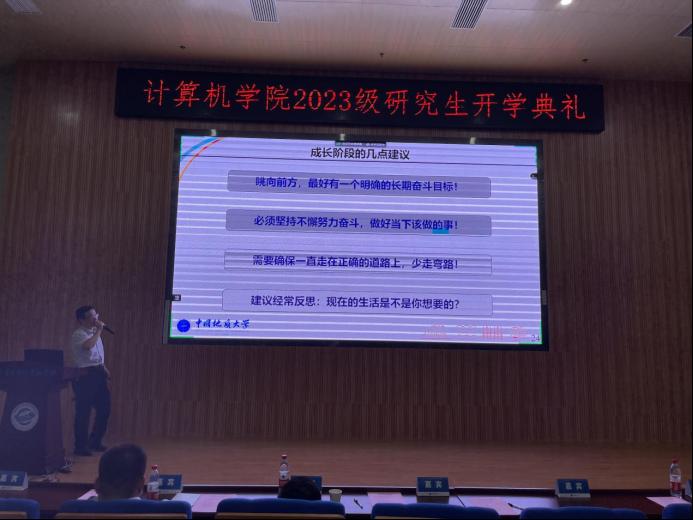 张院长首先肯定了同学们为考研付出的努力,对2023级研究生的到来表示热烈的欢迎。他以学校发展历史与人才培养成绩为切入点,向同学们展示了学校丰厚的底蕴,并从专业设置、师资队伍、科研平台与科研项目等方面介绍了学院近年来发展的概况。他谈到,国家在高新领域的巨大投入以及良好的政策指引,学校深厚的学术科研底蕴和一代代地大人的砥砺奋斗,为今天的在座的同学们奠定了良好的成长环境和优渥的发展平台,希望同学们秉承“艰苦朴素,求真务实”的校训精神,在地大肉漫屋 刻苦钻研,实现出属于自己的新突破,为国家前沿科技发展贡献自己的力量!