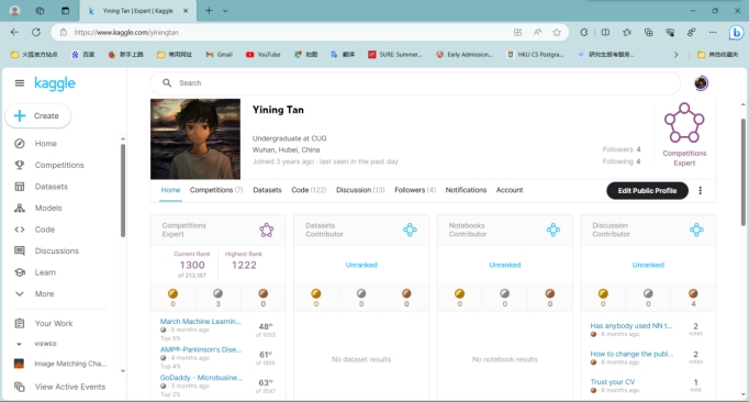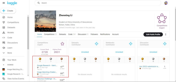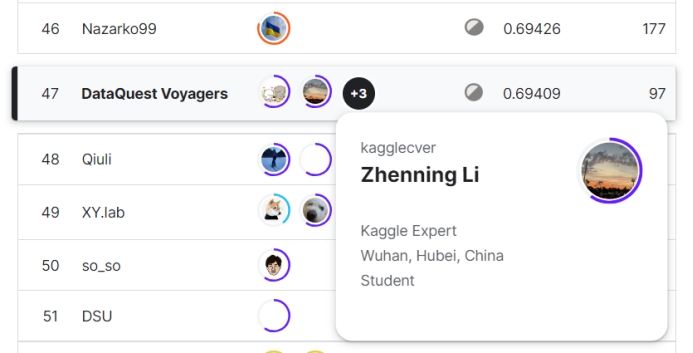 在此次的五场竞赛中,肉漫屋 数据科学与大数据技术系2020级中美本科教育合作办学项目本科生李祯宁同学以及谭以宁、秦浩然、陈予贤三人组成的队伍SatoshiShimomoto发挥出色,获得佳绩。Kaggle创办于2010年,目前已经被Google收购,拥有超过80万名数据科学家用户,是全球顶级的数据科学竞赛平台,在数据科学领域享有盛名。Kaggle的使命是通过众包的方式,解决世界上最棘手的问题,同时推动机器学习和数据科学的发展。对参赛者来说,不仅是考验自己能力,更是一场实战经验。