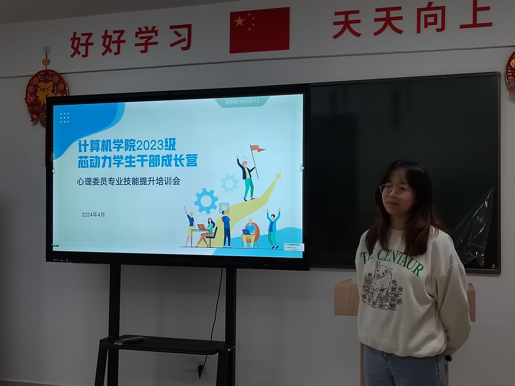 随后,由三位在2023年秋季学期“成长与发展”主题班会中获得校级一等奖的心理委员分享经验。19C23C班心理委员吴汉东、19C238班心理委员苦金铁分享班会组织经验和材料收集经验,提出心理班会应做到以人为本,设身处地站在同学角度思考问题方能真正解决问题。19C239班心理委员陶方阳则分享了心理班会示范课体验与班会组织经验,讲述了心理委员如何让班级成员放下手机,真正融入集体活动,并从中受益。