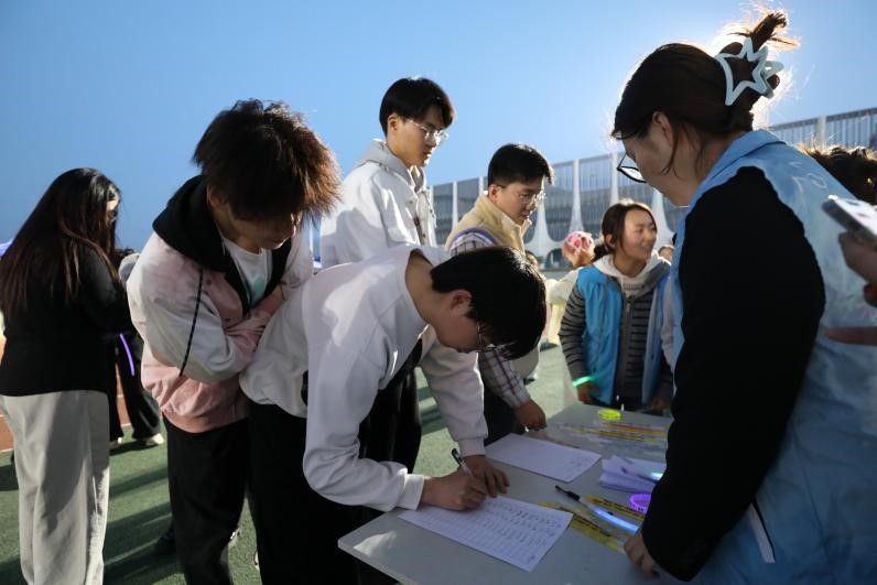 活动伊始,现场气氛热烈非凡。18:30刚过,师生们来到操场签到入场,领取荧光手环后,纷纷与伙伴拍照打卡,记录这一美好时刻。19:00,热身环节开启,动感的音乐响起,大家跟着节奏尽情舞动,迅速摆脱了“开学瘫”,为接下来的运动做好准备。