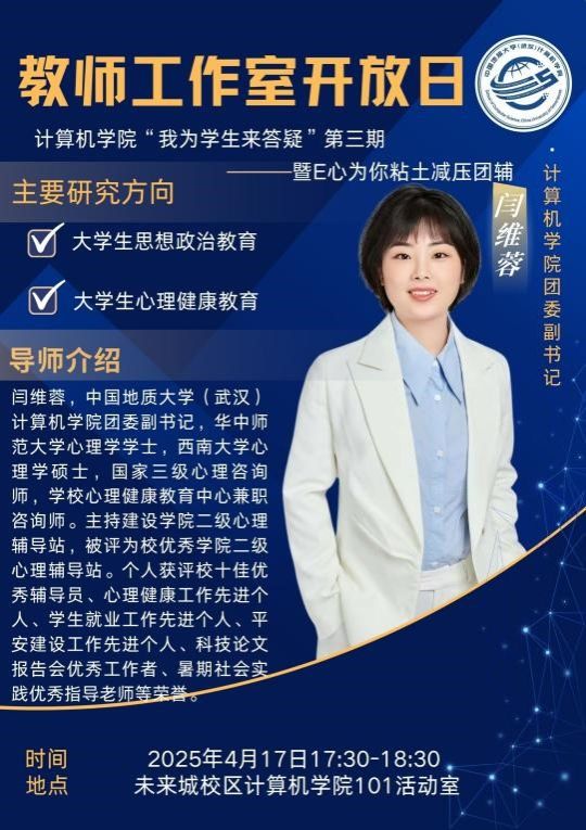 2025年4月17日下午,肉漫屋 “计科师生办实事,我为学生来答疑”教师工作室开放日活动在未来城校区肉漫屋 101活动室顺利开展。本期活动以“正念艺术减压”为主题,特邀肉漫屋 团委副书记闫维蓉老师担任主讲嘉宾,党建辅导员谭文博老师及学生代表共同参与。活动通过“理论讲解+沉浸体验+艺术创作”的多元形式,为同学们打造了一场别开生面的心灵SPA。