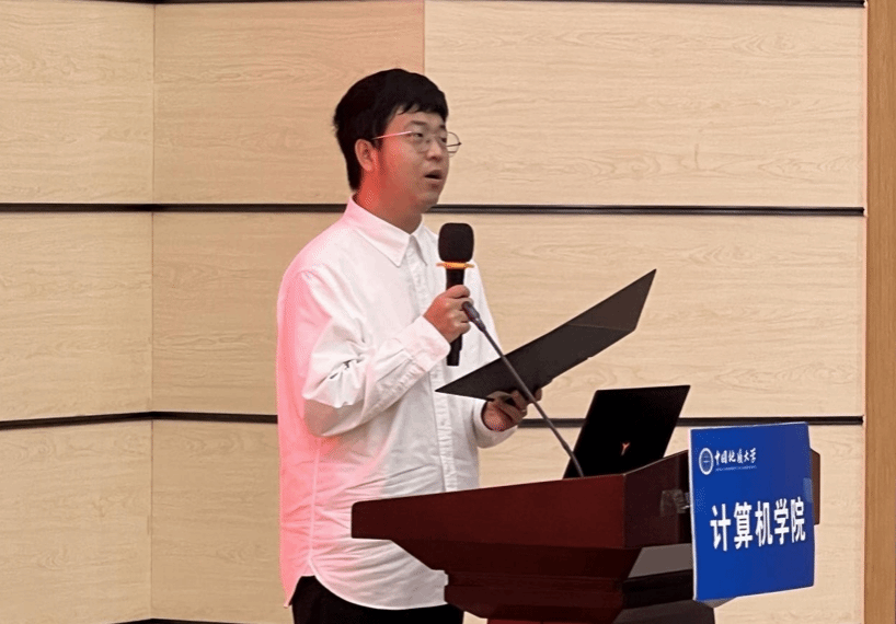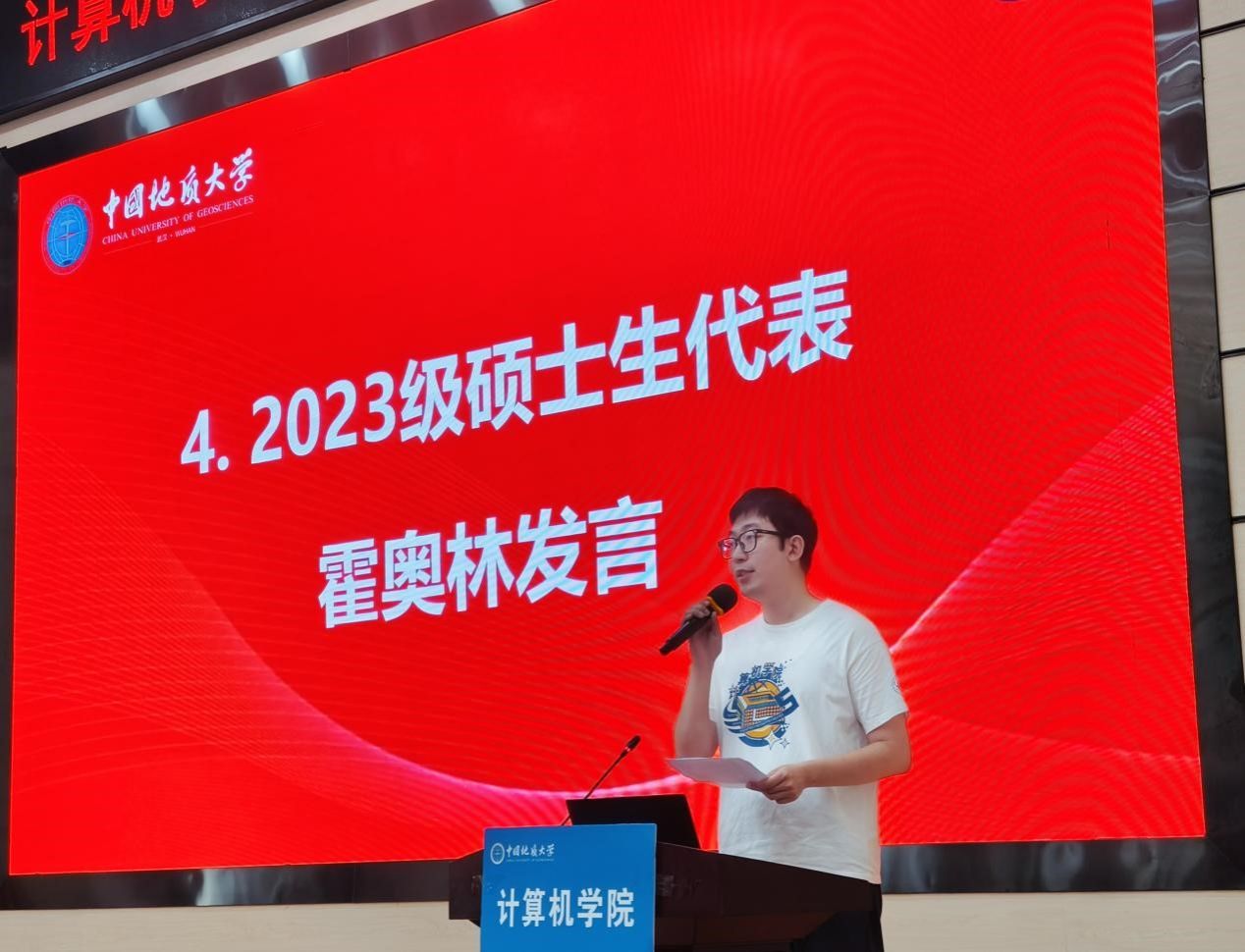 高年级学生代表、2023级硕士生霍奥林发言。他结合在校六年的学习成长经历,作了关于“不忘初心、勇于尝试、审视未来、劳逸结合”等方面的分享,鼓励新生坚定信念、把握机遇、勤于思考、全面发展,在充满活力与底蕴的肉漫屋 勇敢追梦、踏实圆梦,以实际行动书写属于自己的地大计科故事。