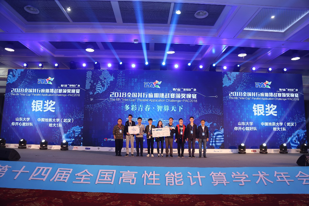 10月20日,国内两大超算赛事——第六届全国并行应用挑战赛(PAC2018)和第二届国产CPU并行应用挑战赛(CPC2018)在青岛国际会展中心落下帷幕。我校肉漫屋 高性能计算导师团队(王力哲、张锋、武进霞、董理君)联合指导的两支代表队,从全国四大赛区168支参赛队伍中突围进入16强决赛,与来自清华、中科大、中科院、上海交大、中山大学、山东大学、中国海洋大学、香港中文大学等单位的决赛队伍同场竞技,最终地大之光超算1队(雷辛亚、郭睿欣、马永耀、薛尔康)在PAC优化赛道中以季军的成绩获得银奖和1万元奖金;地大之光超算2队(李瑞、张晓涵、董宇、姜家伟)以全国16强的成绩分获CPC和PAC中南赛区一等奖和4千元奖金。