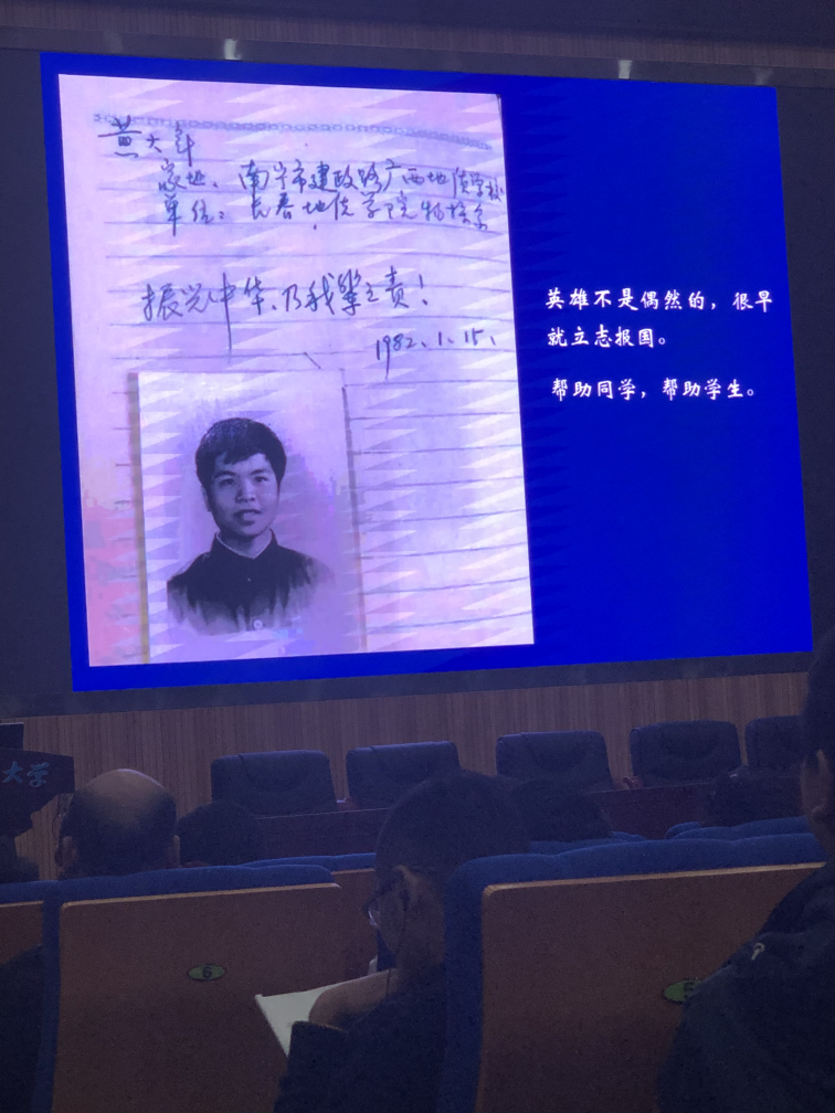 接下来,孟大维教授就黄大年教授的人格魅力进行讲述。1982年1月15日,黄大年在给同学的毕业赠言中写道:“振兴中华,乃我辈之责”。1988年,黄大年加入中国共产党,他在入党志愿书中写道:若能做一朵小小的浪花奔腾,呼啸着加入献身者的滚滚洪流中,推动历史向前发展,才是一生中最值得骄傲和自豪的事情。黄大年在世时,也常与同事谈起邓稼先等老一辈科学家,并曾在朋友圈里提出“黄大年之问”。