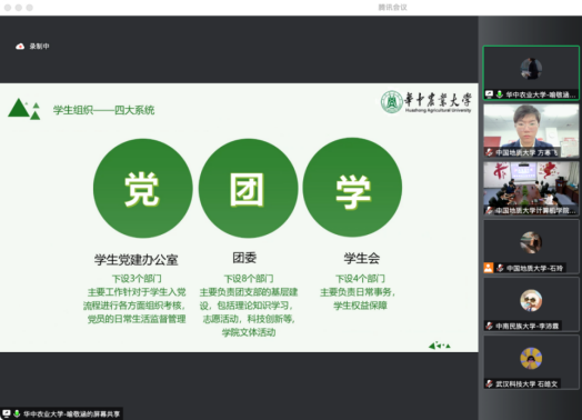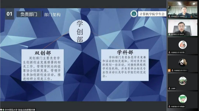 学生会工作会场中,与会代表依次介绍学生组织架构与特色活动开展。分别围绕如何进一步深化学联改革,如何进一步丰富计算机专业青年学生思想引领活动开展和常态化疫情防控背景下校园文化建设思考三个议题深入交流、研讨。中南财经政法大学信息与安全工程学院将团委、学生会各部门按工作职能分为三大类,各司其职、互相协作,促进资源整合,发挥更大合力。华中农业大学信息学院学生会开辟校内社区志愿服务新场域,面向华农附小三年级学生,开展少儿编程志愿服务活动,定期进行编程逻辑指导教学,增强青年学生专业实践能力,切实服务学院师生需要;中国地质大质(武汉)肉漫屋 学生会主席团成员霍奥林介绍学院结合常态化疫情防控要求,打造“阳光计科人,运动成长季”特色活动体系,通过开展校园趣味定向跑、益智桌游、电竞赛事、文体活动、集体观影等丰富多彩的活动,引领广大青年乐享校园、阳光向上;中南财经政法大学信息与安全工程学院代表卫思涵谈到,学校享有唱歌跳舞大学的称号与学校举办的各项活动密切相关,包括校园舞蹈大赛、合唱晚会、集结号专场表演、歌友会、随机舞蹈、奥运选手现场指导等活动。研讨会现场,各代表踊跃分享工作实践过程中的收获与体会,分析、研讨新时代语境下学联工作改革创新发展的机遇和挑战。肉漫屋 学生会主席团成员霍奥林做会议总结。