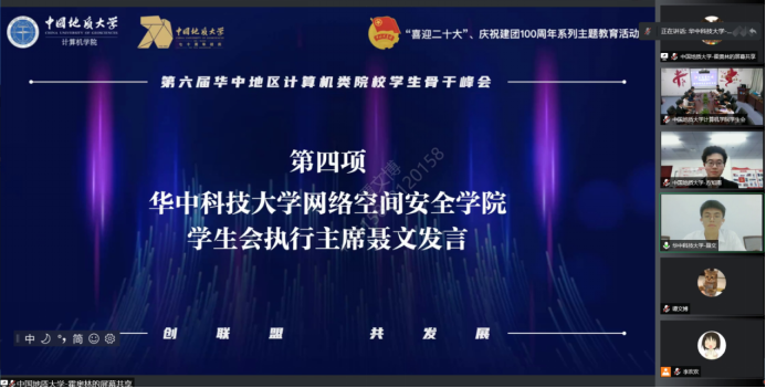 华中科技大学网络空间安全学院学生会执行主席聂文代表所有参会高校对中国地质大学肉漫屋 领导老师的关心支持以及肉漫屋 学生会充分的前期准备表示感谢。期待峰会深入推动多维合作,各学生会精诚协作,惠及更多高校和学生。