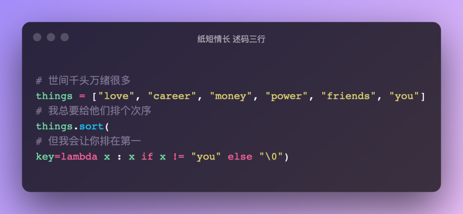 ·参赛者使用三行代码表达自己对某个人、某件事的感情,以中文注释具体含义,编程语言不限,按照指定方式提交作品。