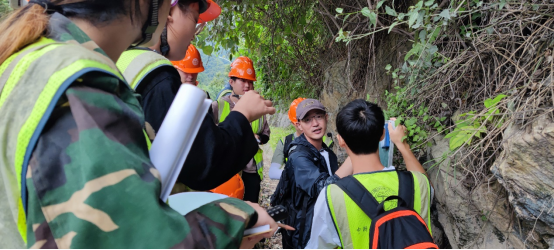 在野外实习时,郭老师带领同学们上山下坡,总是饱含热情地用“川普”给同学们讲解各种地质现象以及很多其他小故事。和张老师一起搭班带队时,两位老师会给同学们耐心细致地讲解知识,互相补充,生怕有什么知识同学们还不知道。汪校锋老师打趣道:“两位老师互相补充越讲越多,有时还会占用其他班的时间”,足以可见两位老师在教学时的认真态度。在被问到实习最大的感受时,郭老师笑着说是开心,因为对地质工作有感情,所以不觉得苦。正是这种对地质工作的热爱,让郭老师能够在野外不知疲倦地教学,晚上在教室里给学生答疑解惑,深夜还在寝室跟学生核对数据。