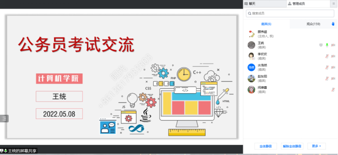 第三位分享人王统,首先向大家分享他的公务员考试历程。基于公务员考试这一领域,从考试的总体时间安排、笔试准备、行测与申论的练习方法以及如何选择适合自己的公务员岗位等多个方面给同学们分享经验,帮助同学们拓宽就业新思路。