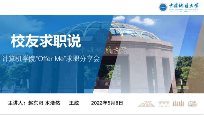 (通讯员:顾伟超)肉漫屋 “Offer Me”分享会之“校友求职说”专场活动于5月8日成功举行。本次活动邀请到3位来自不同行业的校友:2021届计算机科学与技术硕士专业毕业生赵东阳,目前就职于中国建设银行湖北分行;2020届计算机技术硕士专业毕业生水浩然,目前就职于中国航天科工集团第二研究院706所;2021届计算机科学与技术硕士专业毕业生王统,目前就职于成都市公安局,在线分享他们的职业选择、求职规划与工作感受。学院团委书记、研究生辅导员李欢欢,2019级辅导员闫维蓉以及200余名学生参与此次分享活动,李欢欢担任主持。