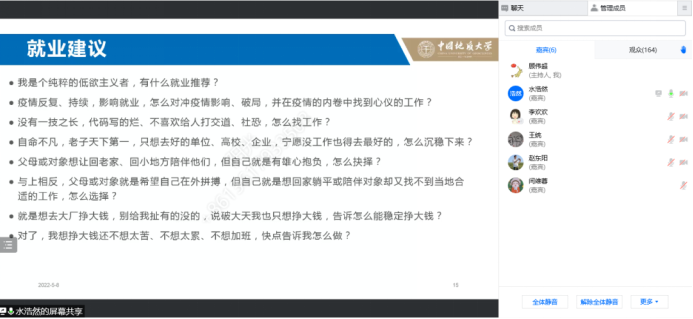 三位校友嘉宾全方位细致地分享他们曾经的职业选择、求职规划与当下的职场感受,从多个维度给出有关求职就业的经验与建议,并且耐心细致地回答与会人员的提问。不少同学表示颇有收获、受益匪浅。