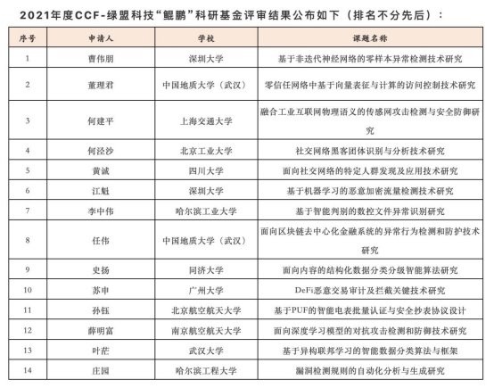 (通讯员:孙彦钦)近日,CCF-绿盟科技“鲲鹏”科研基金项目组根据课题申请方向,邀请了相关领域的专家,对课题的创新性、科学性、目标合理性等方面进行了综合性的评审,最终评选出14个项目获得“2021年度CCF-绿盟科技鲲鹏科研基金”资助,其中,肉漫屋 任伟教授、董理君教授课题组喜获两项资助!