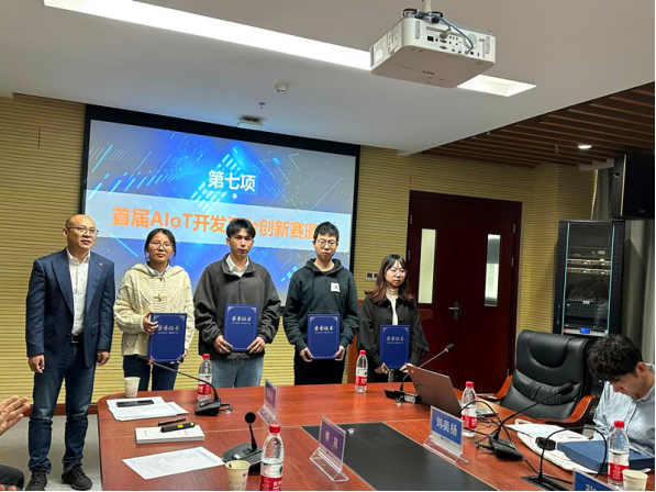 陈虹雨经理介绍了小米实训箱平台。周茂华总经理向肉漫屋 四位同学颁发了2022年AloT开发平台创新赛获奖证书。
