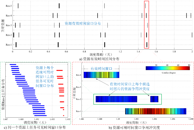 3.设计了面向强时间窗口争用冲突下的大规模任务协同规划方法。构建了面向复杂操作约束的多星多任务混合整数线性规划模型与约束满足最优化模型,设计了面向强时间窗口争用冲突的多敏捷卫星联合调度规划算法,实现了大规模高维优化问题最优可行解的快速生成,显著地提高了调度规划方案最优解的生成及其求解效率。